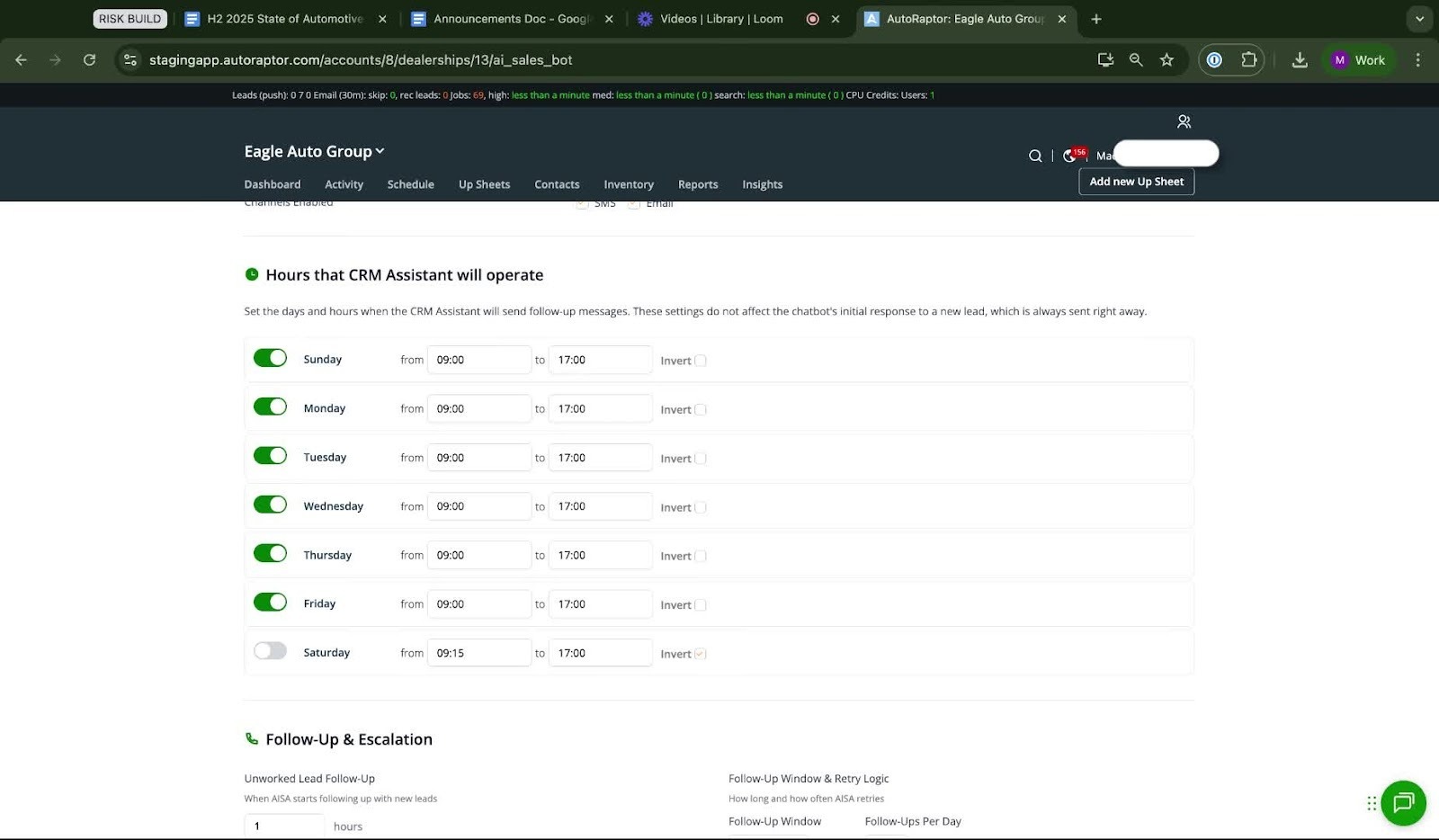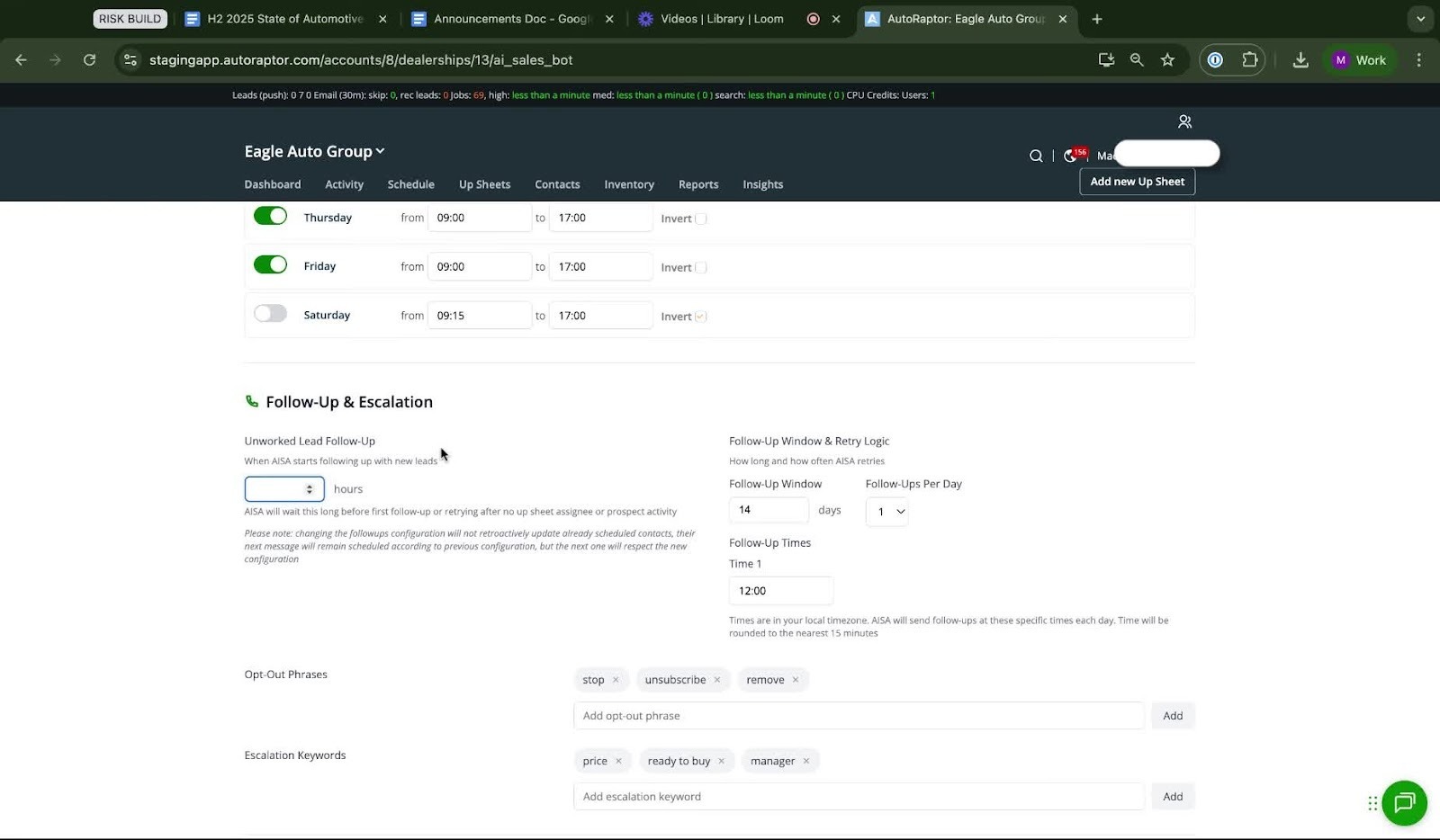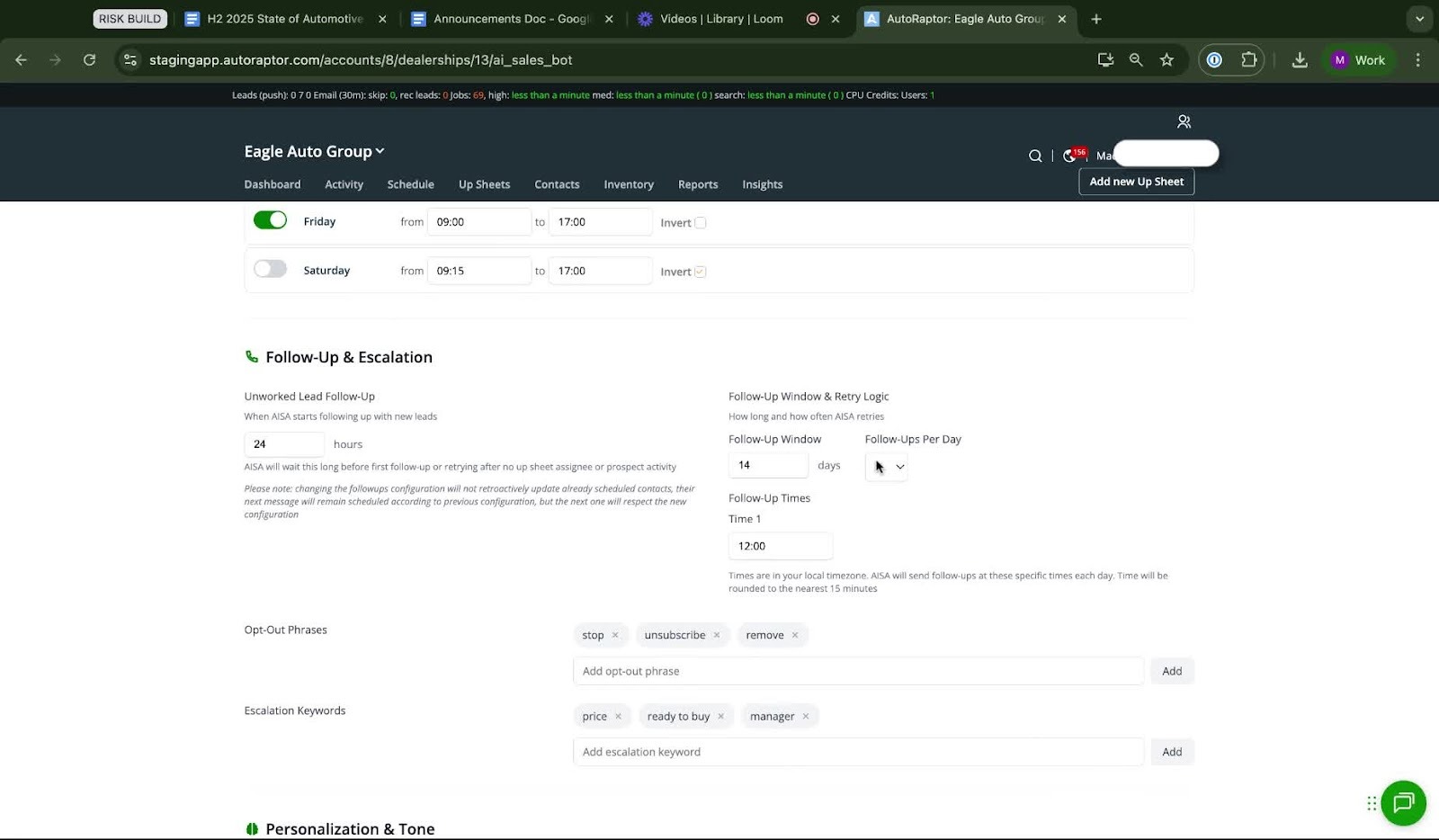 This SOP outlines the steps to configure the hours and frequency of follow-up messages sent by AutoRaptor's AI Sales Assistant.