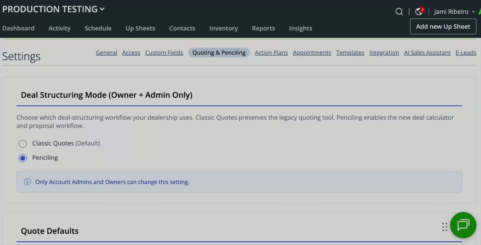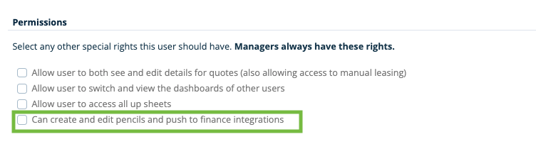- Go over to Users and check the box in the user profile “ Can create and edit pencils and push finance integrations”