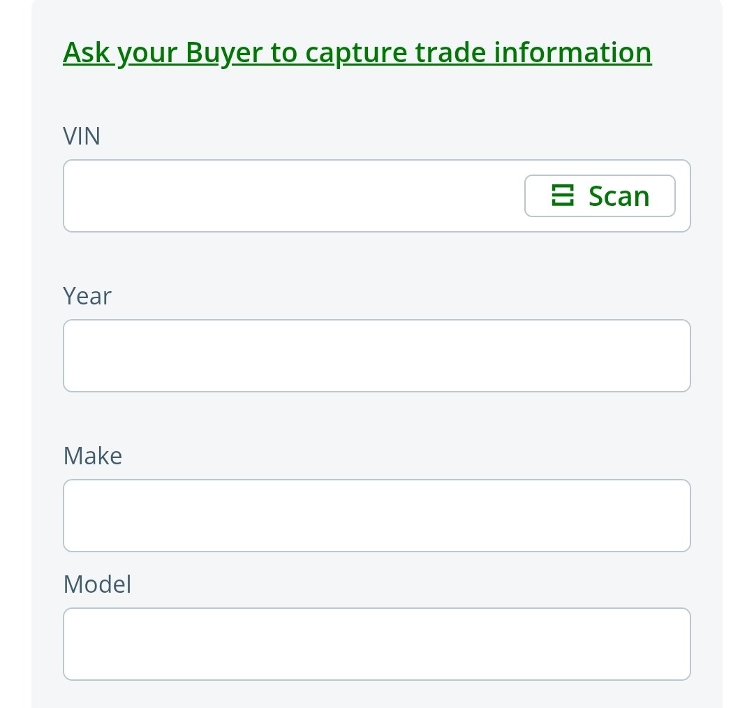 Trade Scanner: The trade scanner will capture the VIN. After entering the year and make, and saving the trade vehicle, the model and trim will also appear.