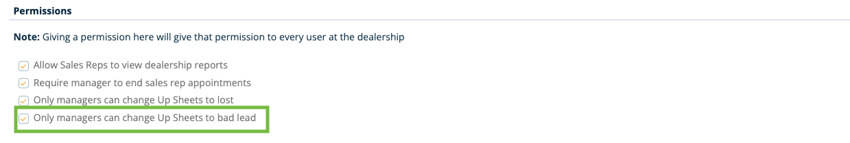 There is also a permission setting that allows Admins to restrict Sales Reps from marking an Up Sheet as Bad Lead. If enabled, only Managers will be able to apply the Bad Lead status.