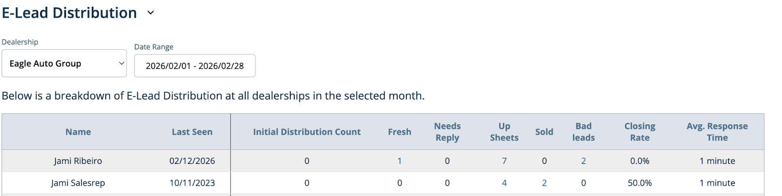 You can also view the breakdown by user in the E-lead Distribution Report for additional visibility and accountability.