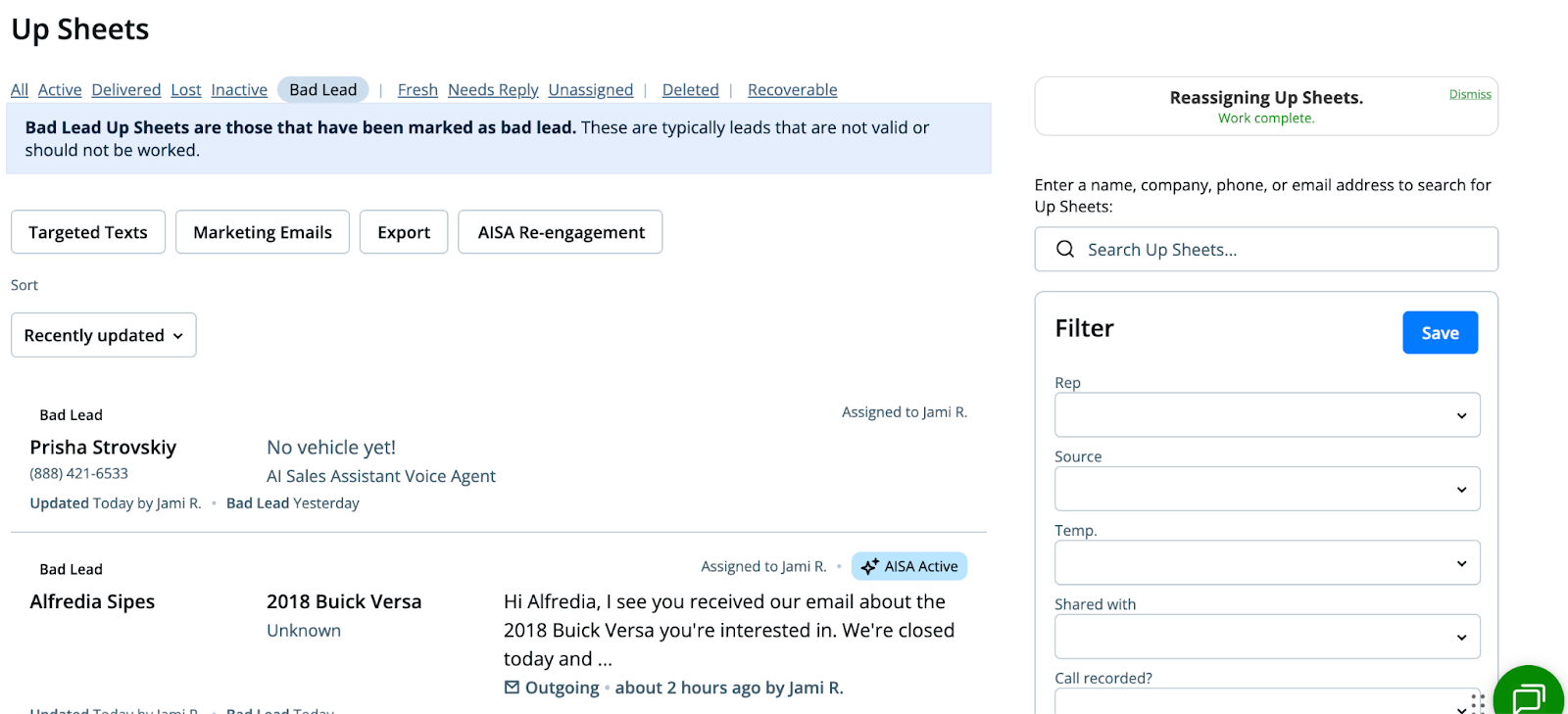 You can view all Bad Leads in their own dedicated list under the Up Sheets → Bad Lead tab.